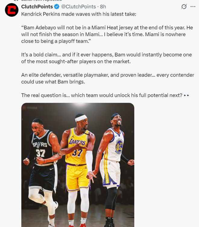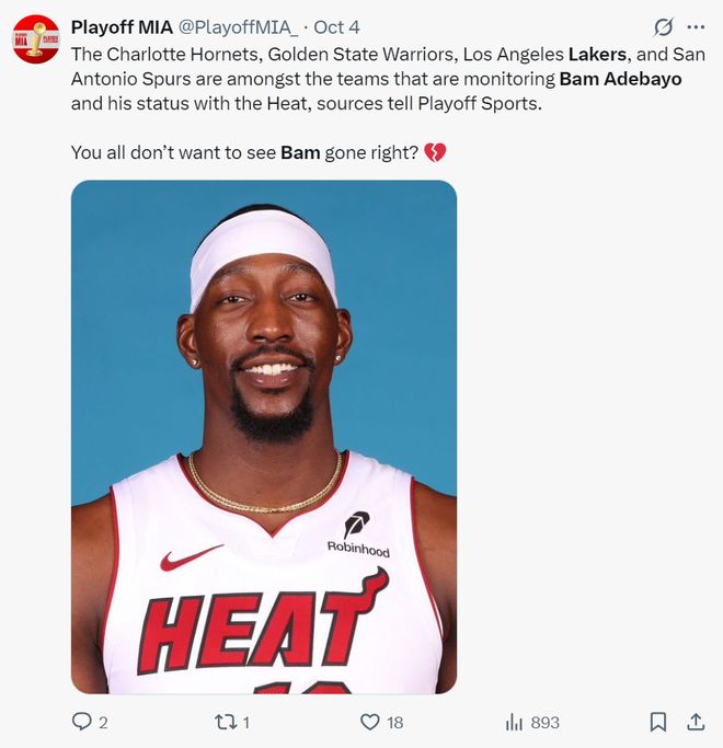 实际上在10月4日,就有美媒爆料,夏洛特黄蜂、金州勇士、洛杉矶湖人、圣安东尼奥马刺都在密切关注巴姆-阿德巴约以及他在热火队的状况。(热火媒体不希望看到热巴离队)