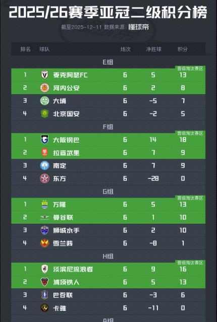 北京时间12月11日,25/26赛季亚冠二级联赛东亚区小组赛全部结束。晋级东亚区八强的球队随之出炉。